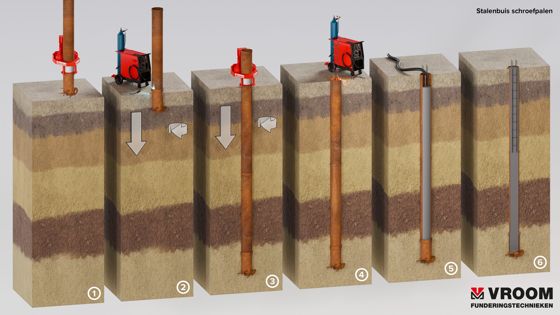Vroom Funderingstechnieken stellt Stahlrohrverdrängungspfähle gemäß einem von Vroom Funderingstechnieken erstellten Ausführungsverfahren im Rahmen der internen Qualitätsüberwachung und landesweit geltenden Normen her.