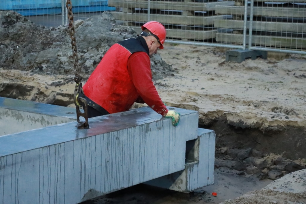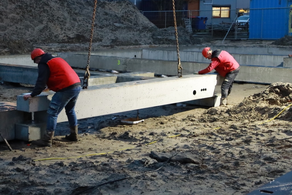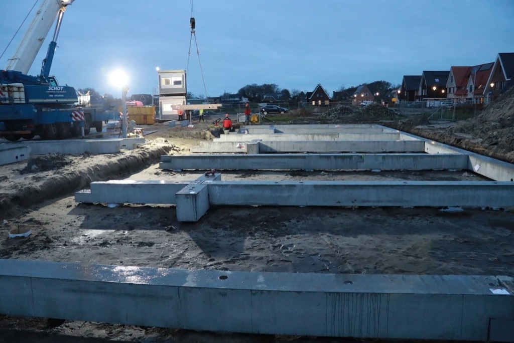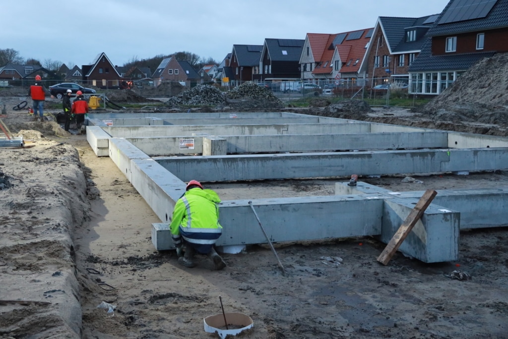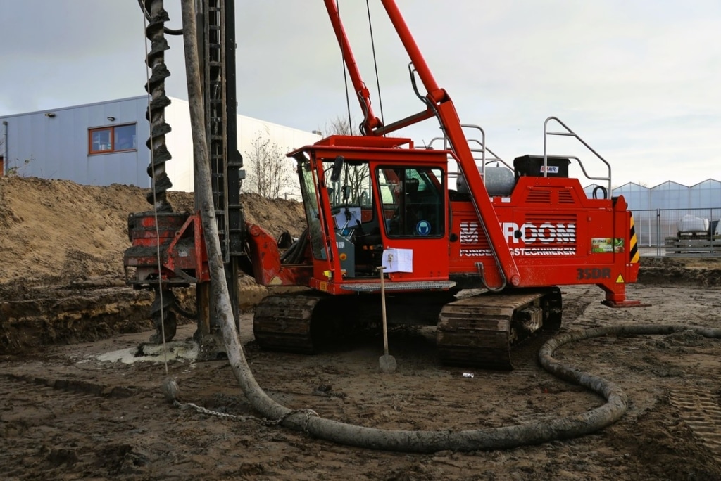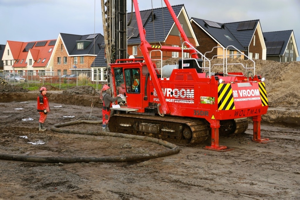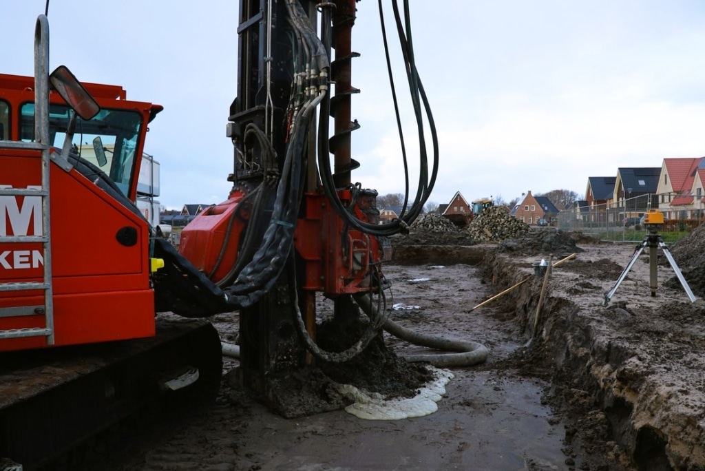 Die Kombination von Erdarbeiten mit Saugpumpen und Dränen ist entscheidend. Die Kombination aus Betonschraubpfählen und vorgefertigten Fundamentbalken bedeutet, dass das Arbeitniveau 4 cm unterhalb der Unterkante des Fundaments sein muss. Eine präzise Handhabung durch den Erdarbeiter und das Bohrteam von Vroom ist dabei wesentlich. Die ausgezeichnete Kommunikation zwischen allen beteiligten Parteien spielt eine wichtige Rolle für den reibungslosen Verlauf des Projekts.