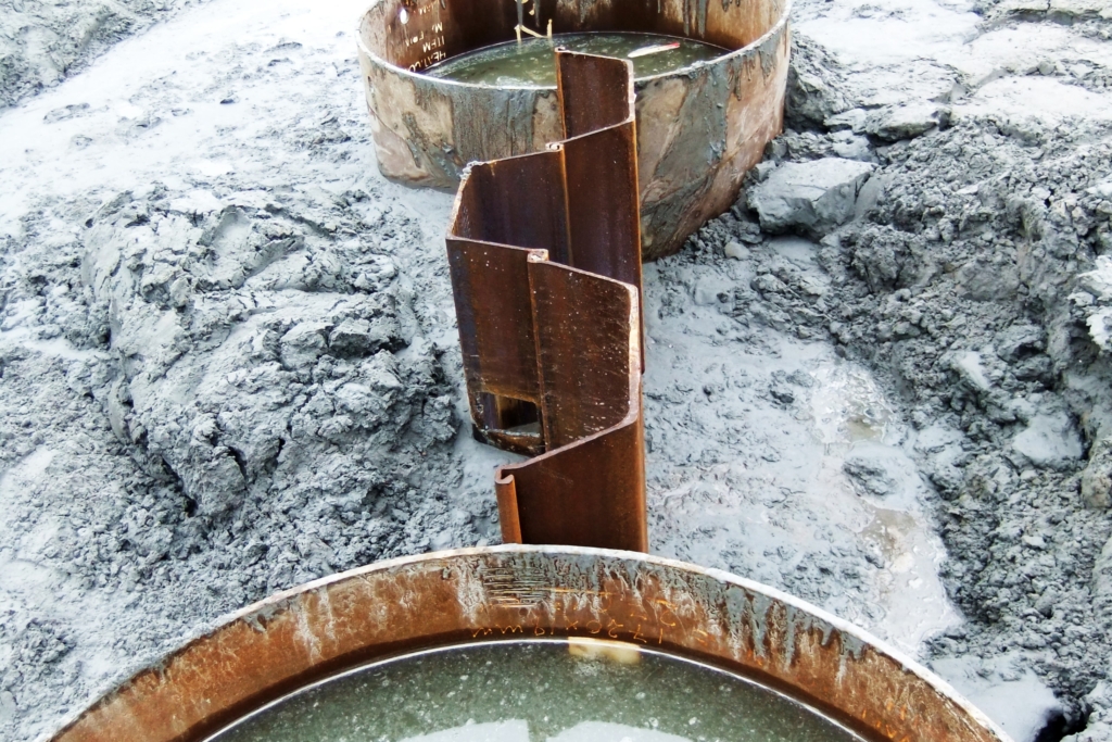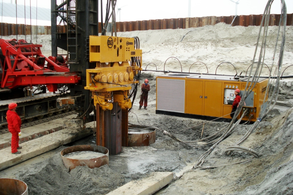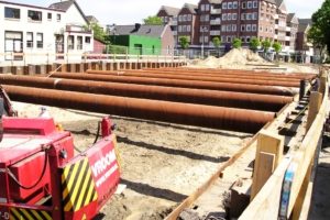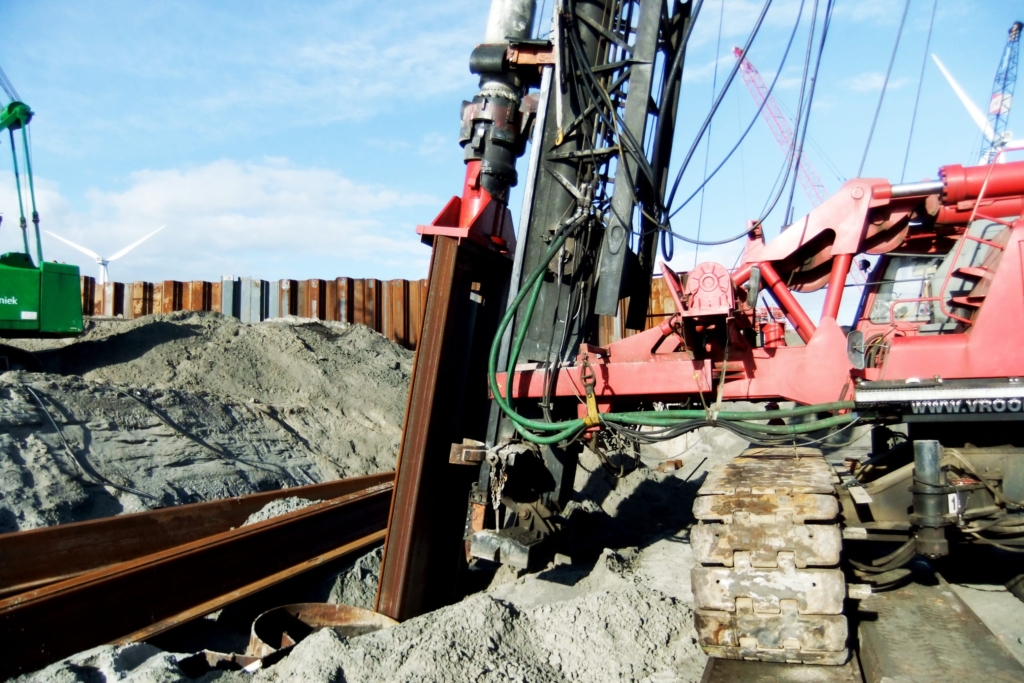 The most common method to install a steel sheet pile wall is using a vibrating block. This block is clamped on top of the sheet pile element to be inserted. By vibrating the block, the resistance decreases and the sheet pile element sinks into the ground or is pushed in. The next element is placed in the slot or groove of the previous one and is brought to depth in the same way. With the clamped vibrating block, a vibrated sheet pile profile can also be pulled out in reverse. Sheet pile elements can also be installed by driving. This method does not allow for extraction.