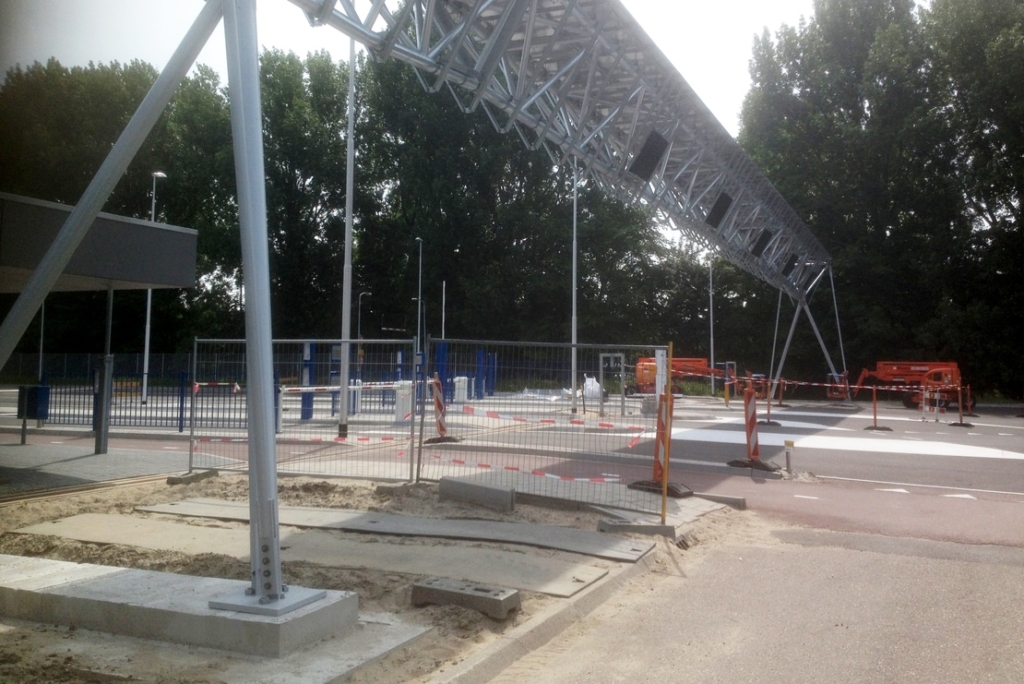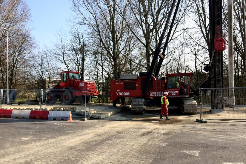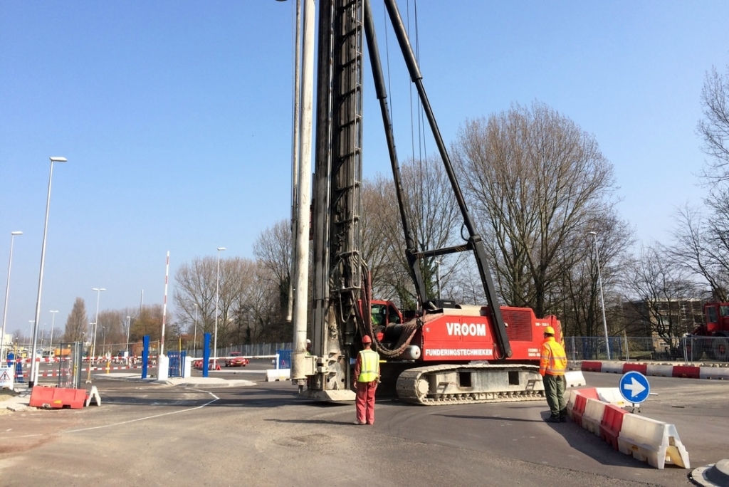 To both ends of the entrance, VGS piles with grout have been applied. In the meantime, the DSM site’s access road had to be crossed under the guidance of DSM as well as Heijmans security officers. Following the crossing, also to the entrance’s other side, 4 VGS piles have been applied with low-vibration levels.