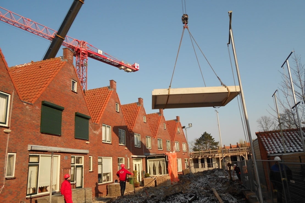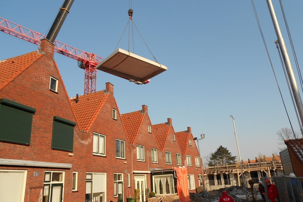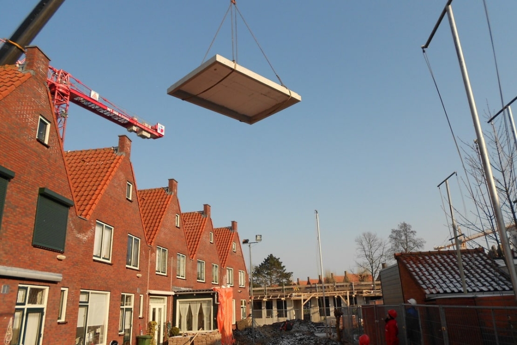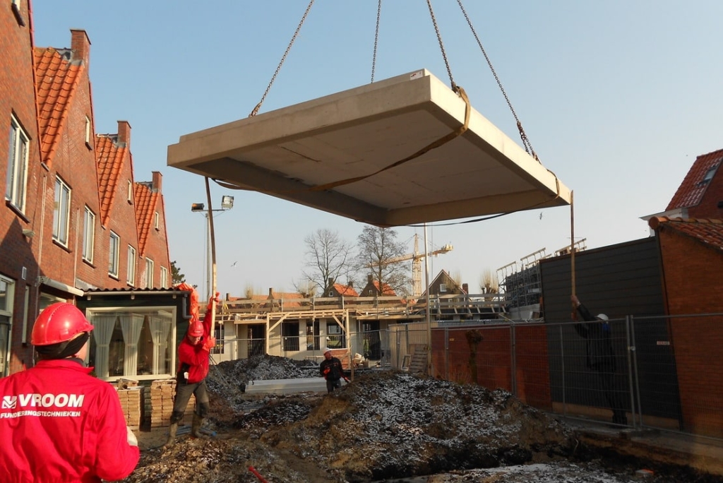 On the prefab shed floors measuring a fair 4 x 6 m, 2 sheds will be built. The floors have already been equipped with lines for water and electricity in the factory. Special transport for the large floor elements was necessary. First, a license was applied for as the traffic on the supply route had to be stopped in order to get the truck carrying load sticking out on both sides over two lanes to its final destination at the same time. On the building side, the prefab floors have been transferred from the truck using a crane and mounted on the driven steel tubular piles. Under supervision, the floors were taken from the factory just in time. On the building site, the crane could move quickly allowing the mounting process to proceed. In tow shifs, 3 single and 12 double shed floors have been mounted. The planned area for the 84 apartments is bordered by Julianaweg, Kielstraat, Zwaardstraat and Schippersgracht. For this project, 35 family homes will make room for 84 apartments, health care station, meeting room and one family home on street level. Underneath a part of the apartments, a full in-depth parking garage is realized offering around 120 parking lots. In addition, in the Boegstraat, for 27 homes the sheds will be replaced. The homes themselves will not be demolished, but renovated.