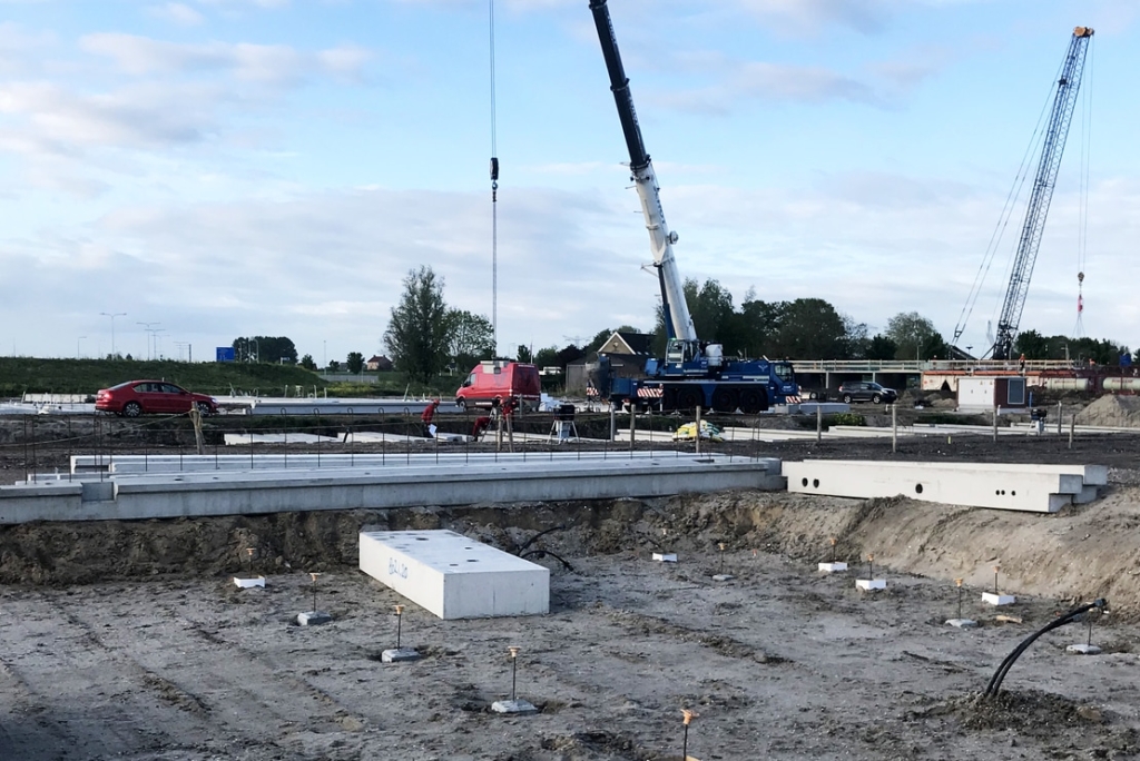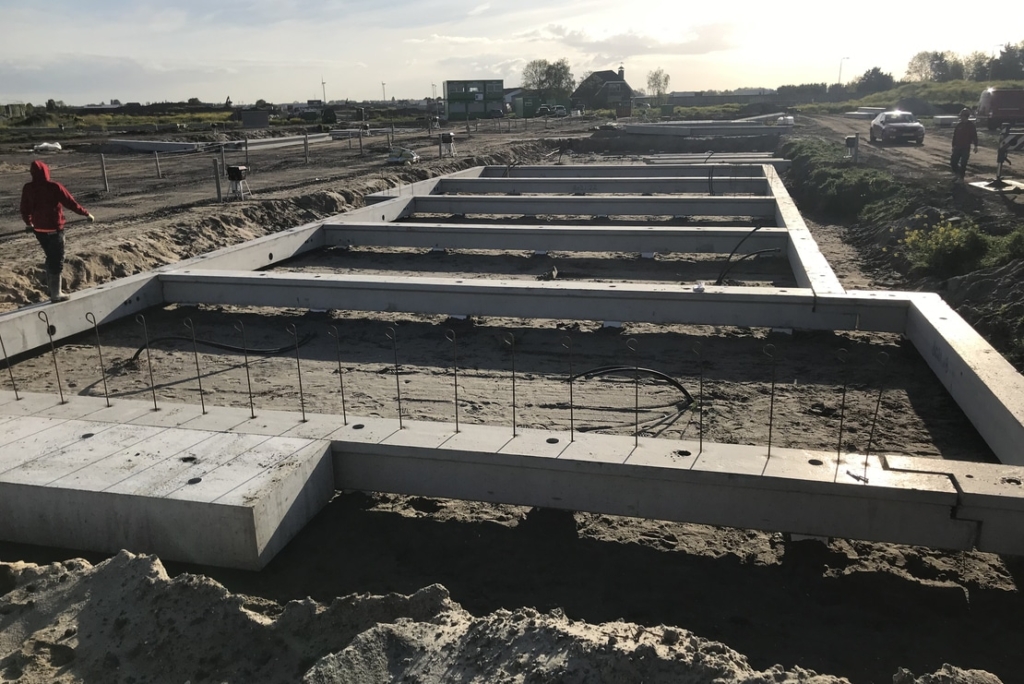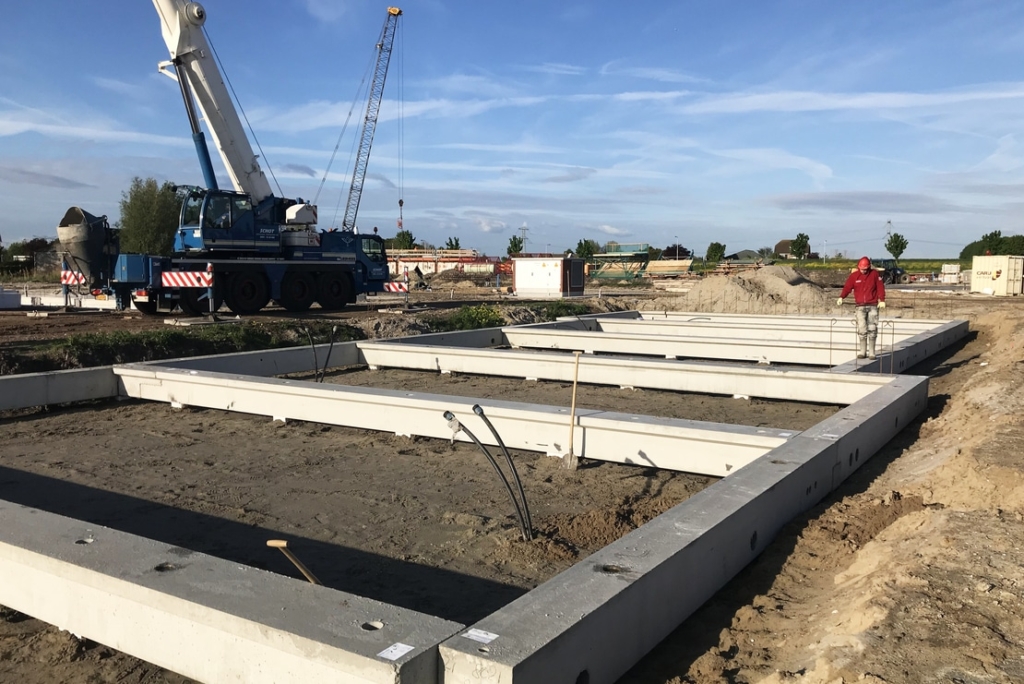 First of all we installed the pre-cast concrete piles that had been made in the factory. We fitted bars to the piles that connect to the pre-cast foundations. The foundations, too, were pre-cast in the factory to accommodate ducts for rainwater drains, building services and such like. This was all put together by us on-site using a telescopic crane and two builder’s labourers. Once all elements were in place they were cast in place, forming an assembly with the piles.