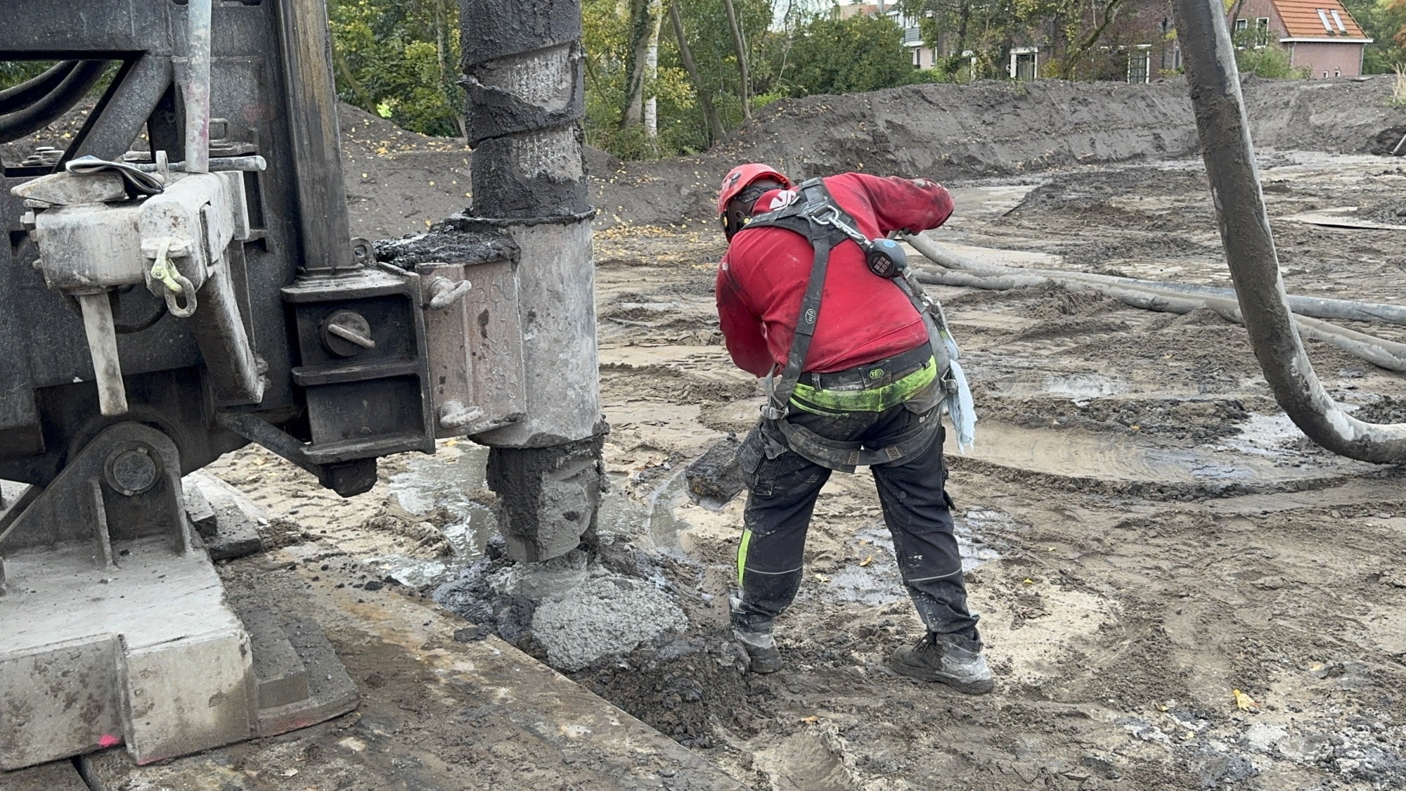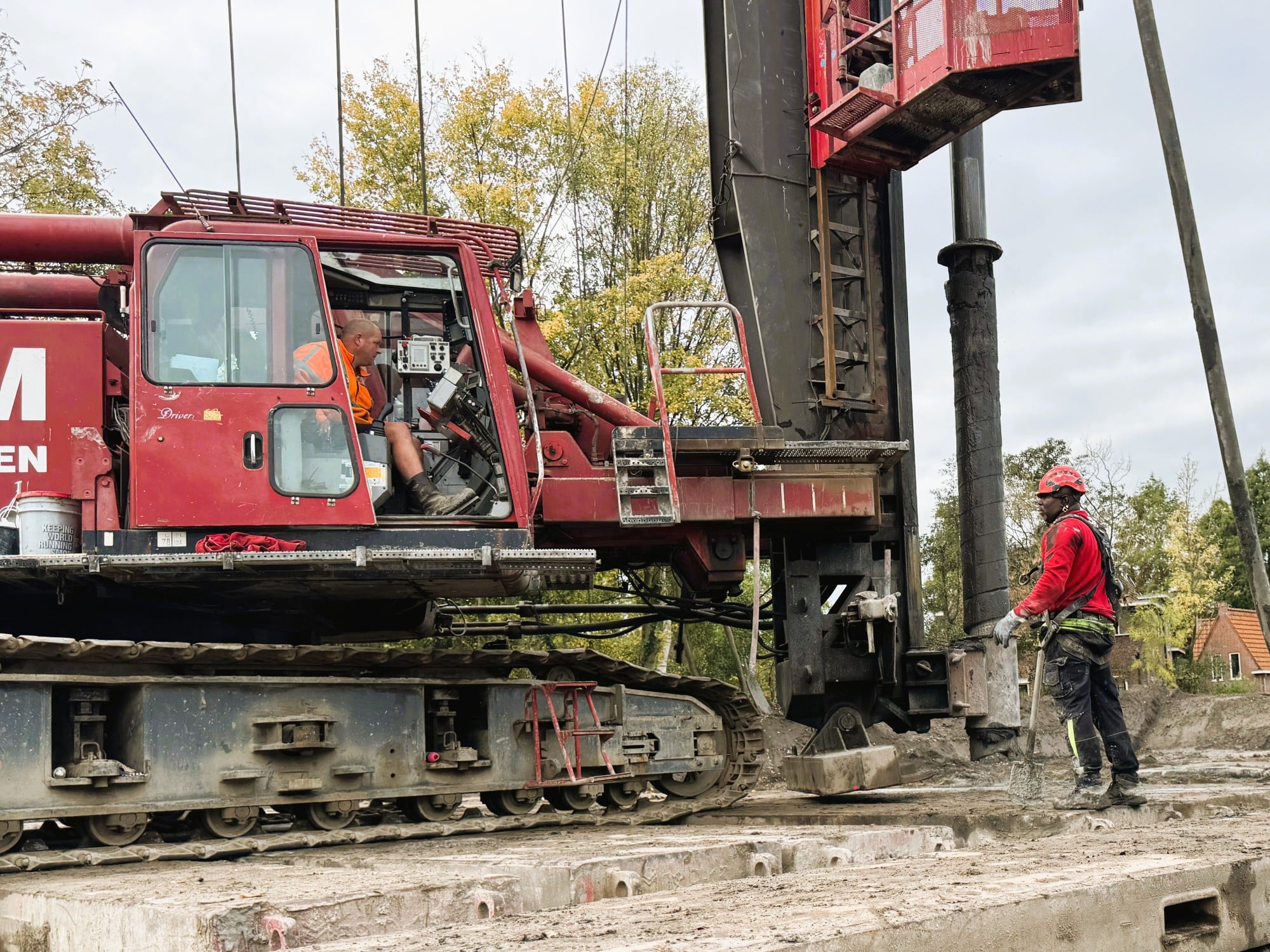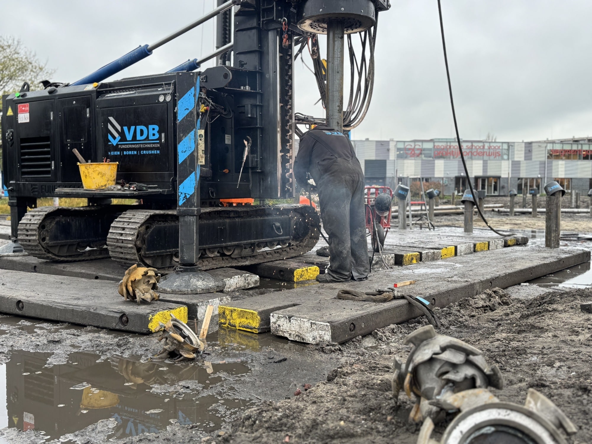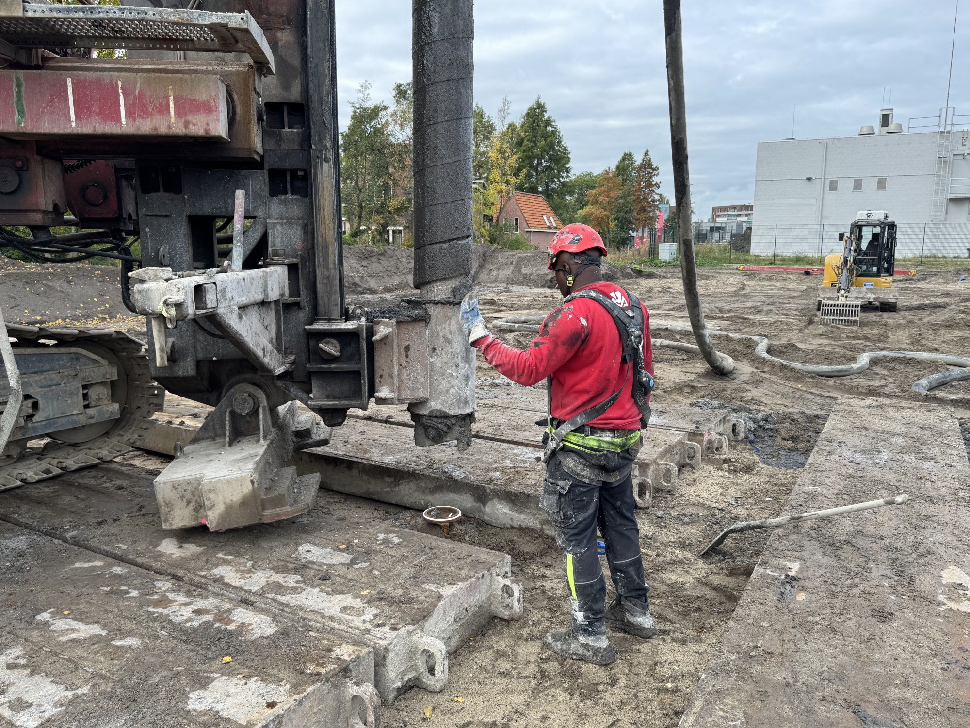 The foundation of this new neighbourhood consists partly of DPA screw piles: a displacement, low-vibration system that produces hardly any drill spoil. Vroom Betonbouw handled the setting-out and installation of prefab beams, chambers and storage floors. The steel tubular piles were installed by VDB Funderingstechnieken using compact foundation rigs that are ideal for working in confined spaces. In addition, Hadek carried out part of the concrete work using traditional methods, combining on-site craftsmanship with Vroom’s technical expertise. This enables efficient construction in an area with complex urban lines and level differences.