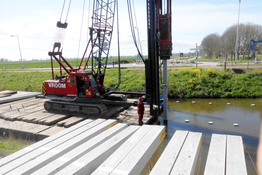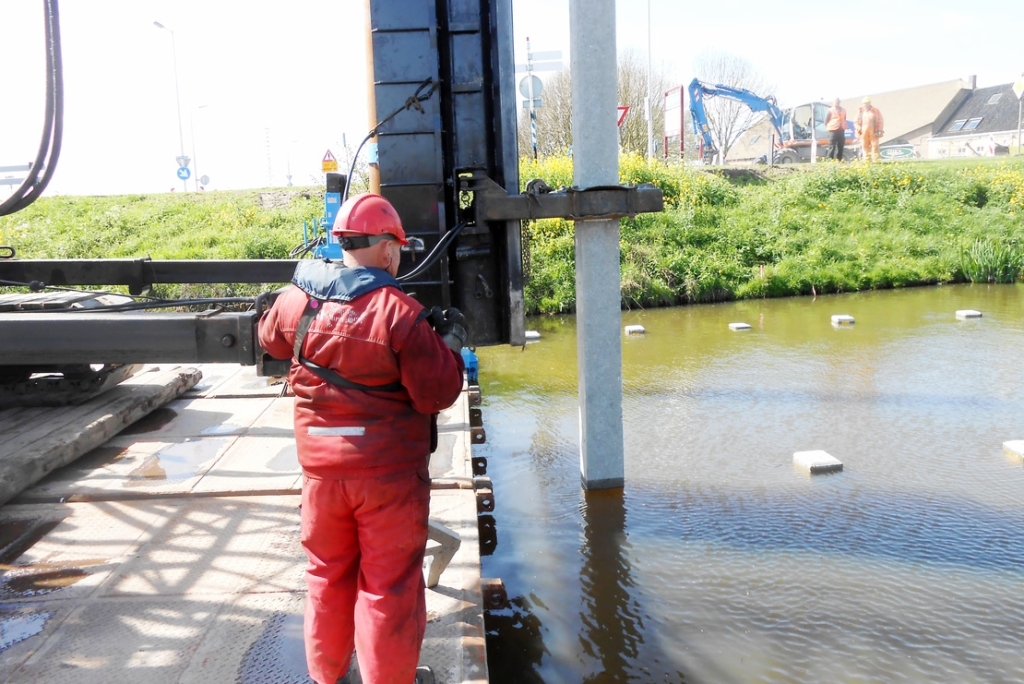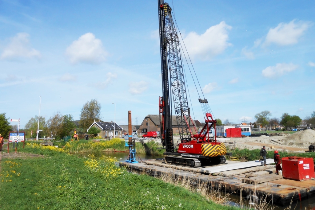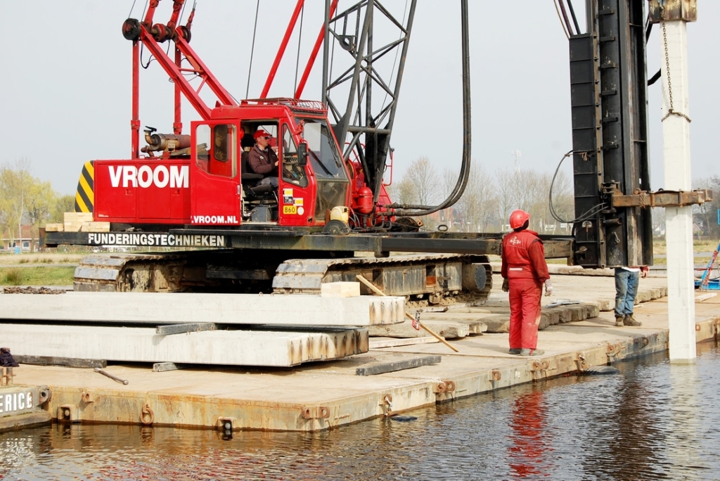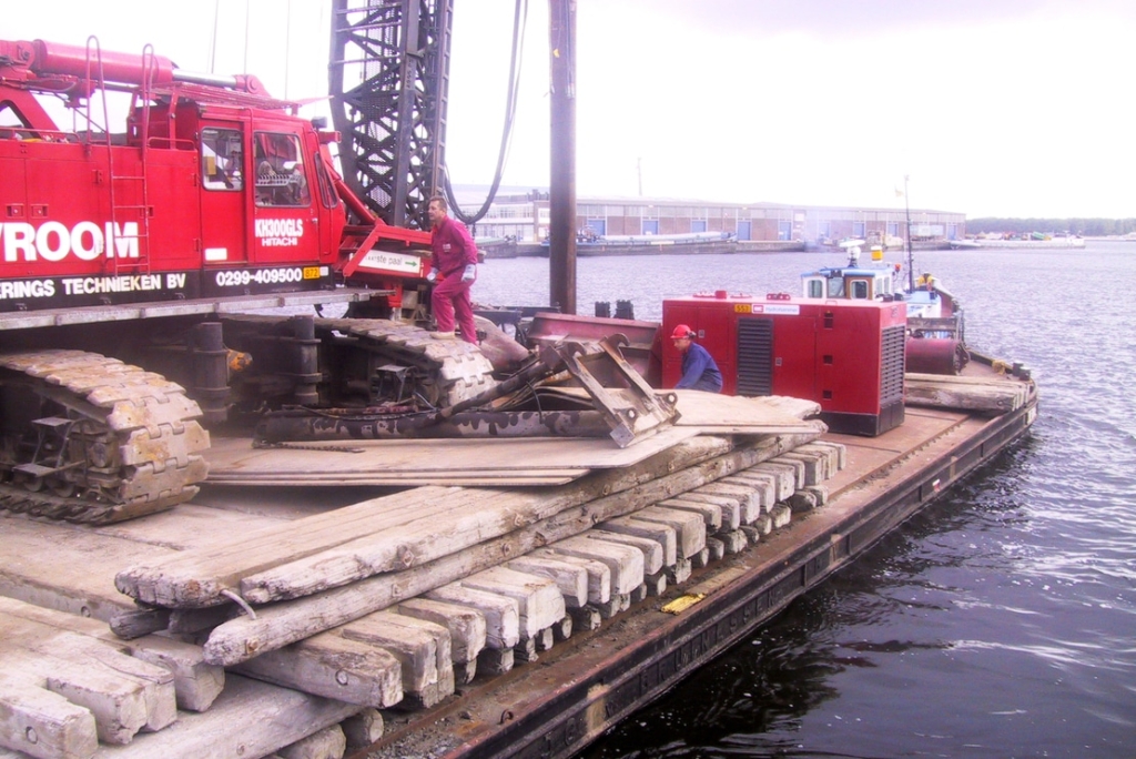 Een spectaculair gezicht is het zeker wanneer een grote funderingsmachine in volle glorie op een ponton over water naar de werklocatie wordt gevaren.