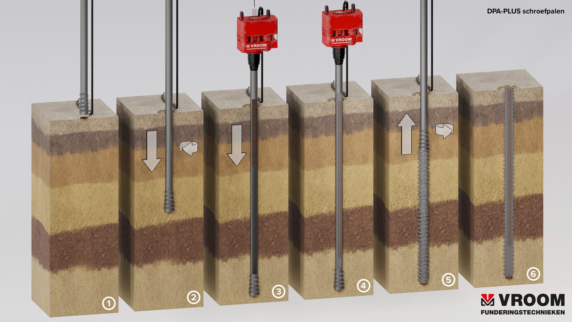 De DPA-PLUS schroefpalen worden bij sonderingen tot de berekende inschroefdiepte ingebracht. Het benodigde boormoment wordt hierbij gemeten ter beoordeling en herkenning van de aanwezige grondslag.
