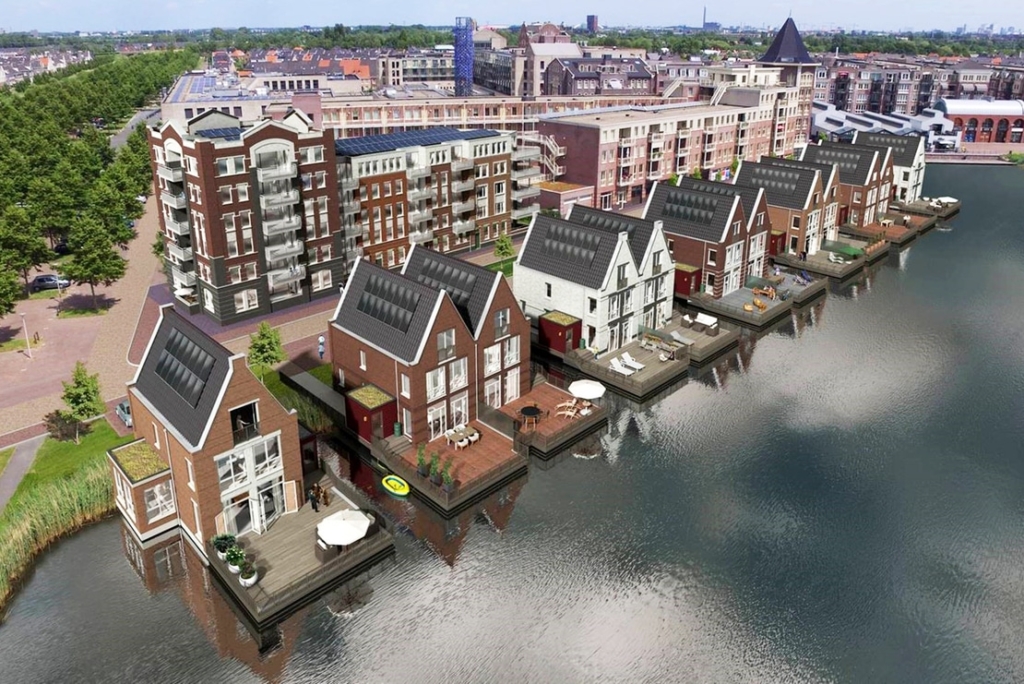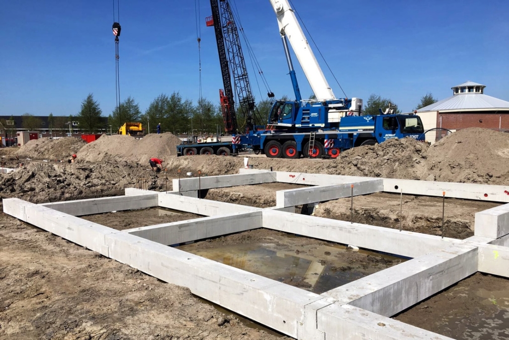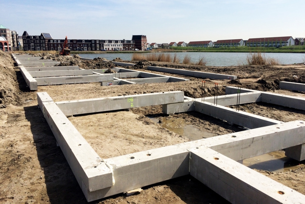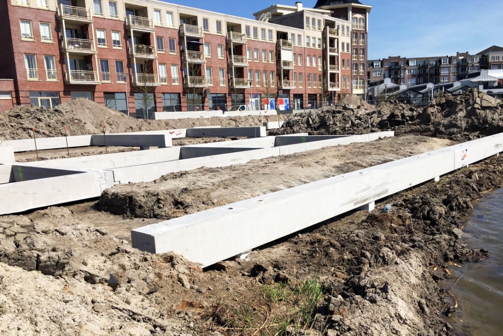 In het centrum van Vleuten worden aan de rand van het meertje 12 waterwoningen gebouwd. De woningen liggen met de voorzijde aan straatniveau en de achterzijde met het terras net boven het water. Een prefab fundering is ideaal wanneer je bouwt in of aan het water. De hele fundering is op één lange dag gemonteerd.