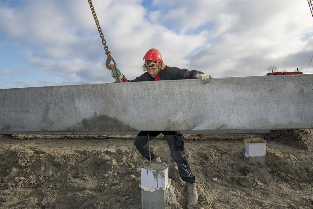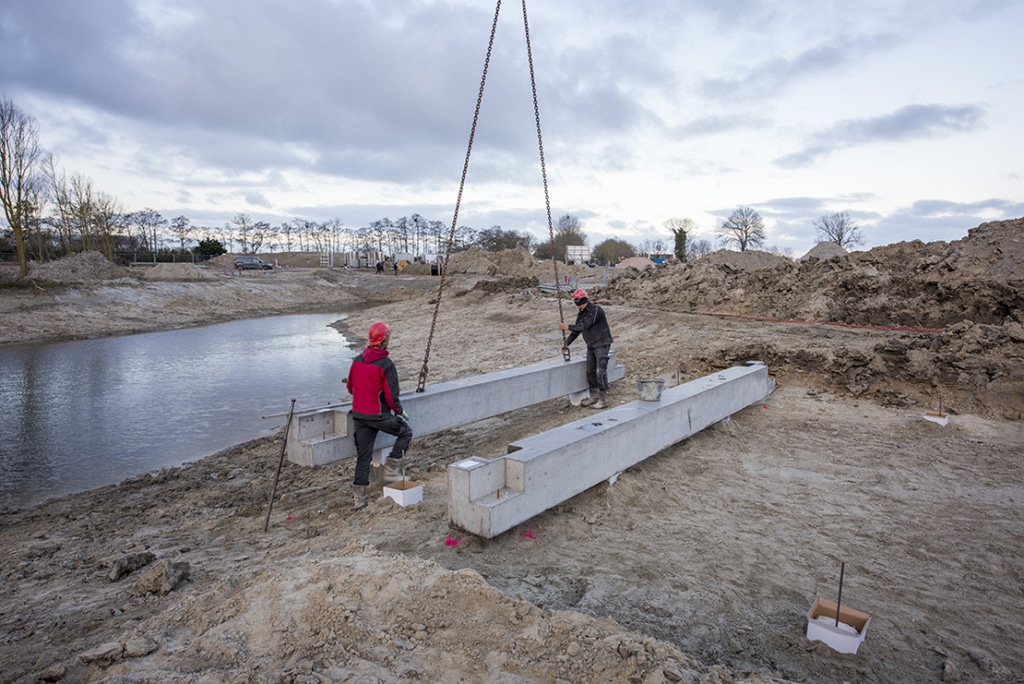 Om de elementen exact te positioneren is nauwkeurige maatvoering nodig. Voor de maatvoering wordt een houten piket geslagen met daarin een draadnagel, die het meetpunt aanduidt. In de heipalen boren we een gat waarin met gebruik van krimparme mortel een stek verlijmd wordt. De heipalen worden voorzien van een tijdelijke kartonnen bekisting. Hierin markeert de stelleur met gebruik van de laser de aanleghoogte van de funderingsbalk. Daarna vult de stelleur de bekisting tot aan de markering met gietmortel, die vlak uitvloeit. Twee stelleurs en een mobiele kraan monteren de prefab funderingsbalken.