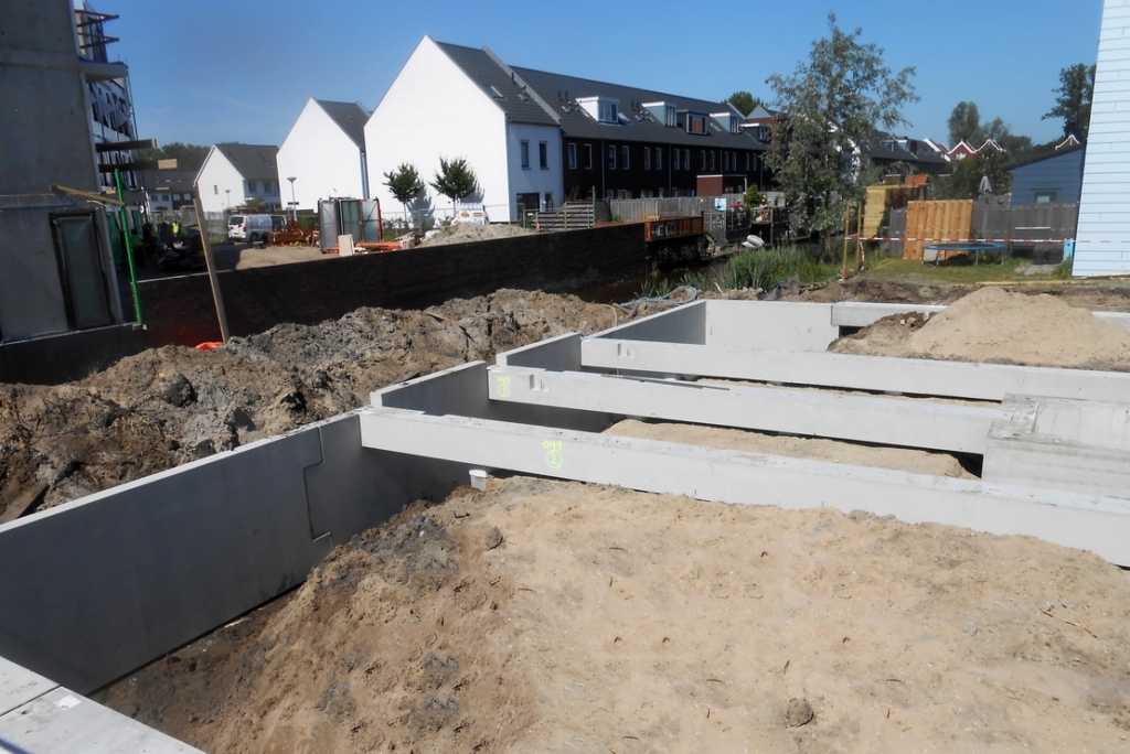 Als tijdelijke belasting is op de bouwlocatie een dikke laag zand aangebracht. Het heiwerk wordt bovenop die zandlaag uitgevoerd en de palen moeten dan ook een behoorlijk stuk verdiept worden weggeheid. Na het heiwerk is de bouwput ontgraven tot de onderzijde van de fundering, zodat meteen de kruipruimte is ontstaan. Aan de kant van de gracht is een prefab kademuur geplaatst. De hoge elementen moesten in een kort tijdsbestek worden gerealiseerd en daarom is gebruik gemaakt van prefab elementen. Vroom heeft de prefab fundering in één dag geplaatst.