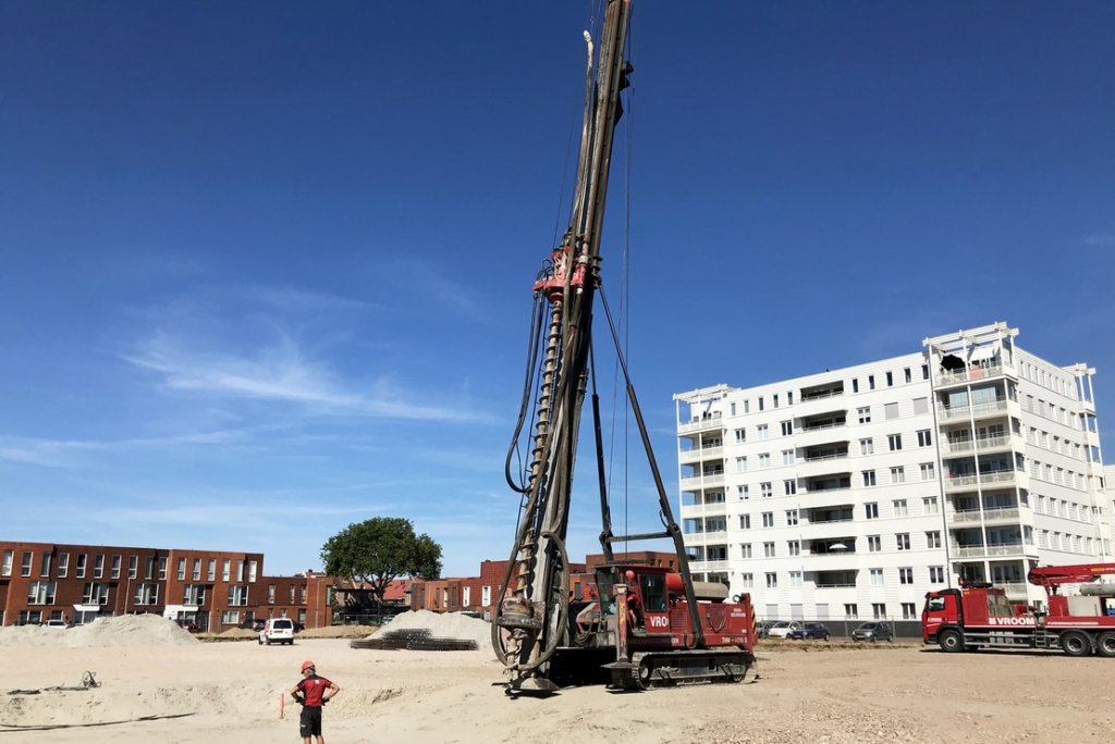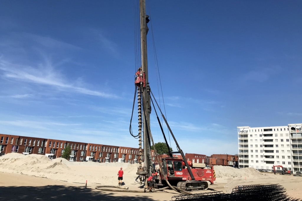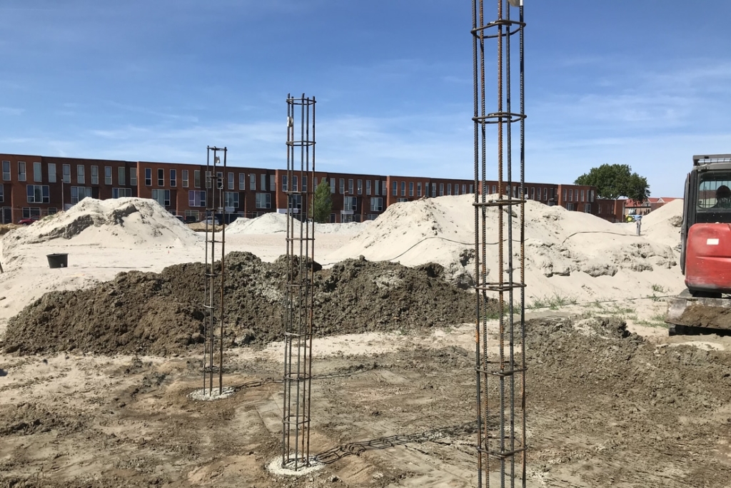 In een parkachtige omgeving, achter het duin van IJmuiden, verrijst De Binnenhaven: een gevarieerd nieuwbouwproject met eengezinswoningen en appartementen in een informele architectuurstijl. Voor 50 woningen maken wij eerst 316 stuks palen en vervolgens komt Vroom Betonbouw een paar weken later terug om prefab funderingsbalken te monteren. Een mooi combinatieproject!