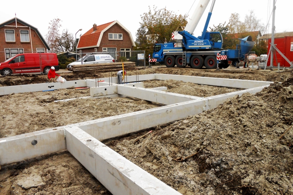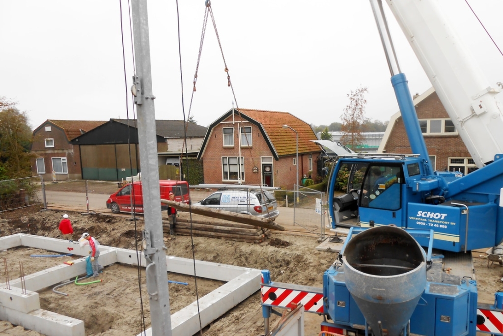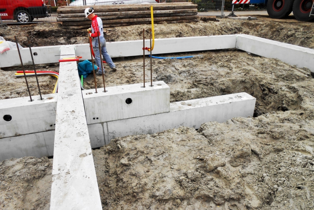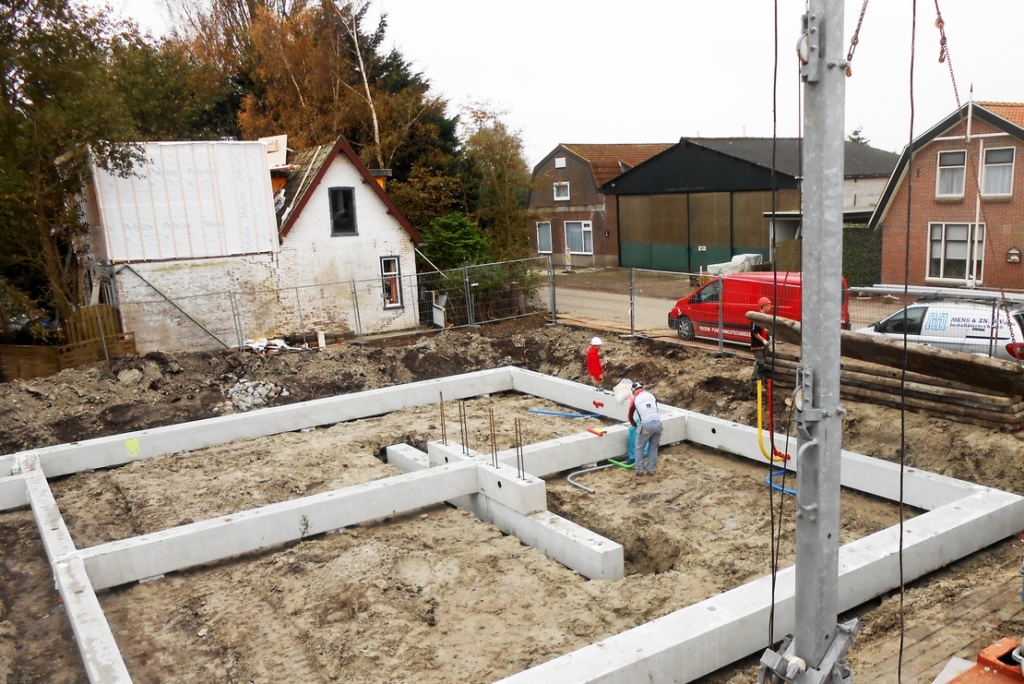 Tijdens het monteren van de prefab fundering was de loodgieter aanwezig. Direct nadat de eerste funderingselementen waren geplaatst, heeft de loodgieter het leidingwerk door en langs de prefab fundering gemonteerd. Deze samenwerking zorgde ervoor dat de vloer aansluitend aan de werkzaamheden van de loodgieter kon worden gemonteerd.