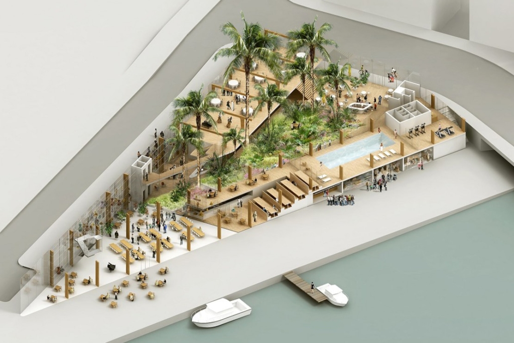 In dit hotel van 12.500 vierkante meter komen zelfstandige publieksfuncties: restaurant, skybar, conferencezaal, wellness & fitnessruimte, zwembad, subtropische tuin, park en een ondergrondse garage.