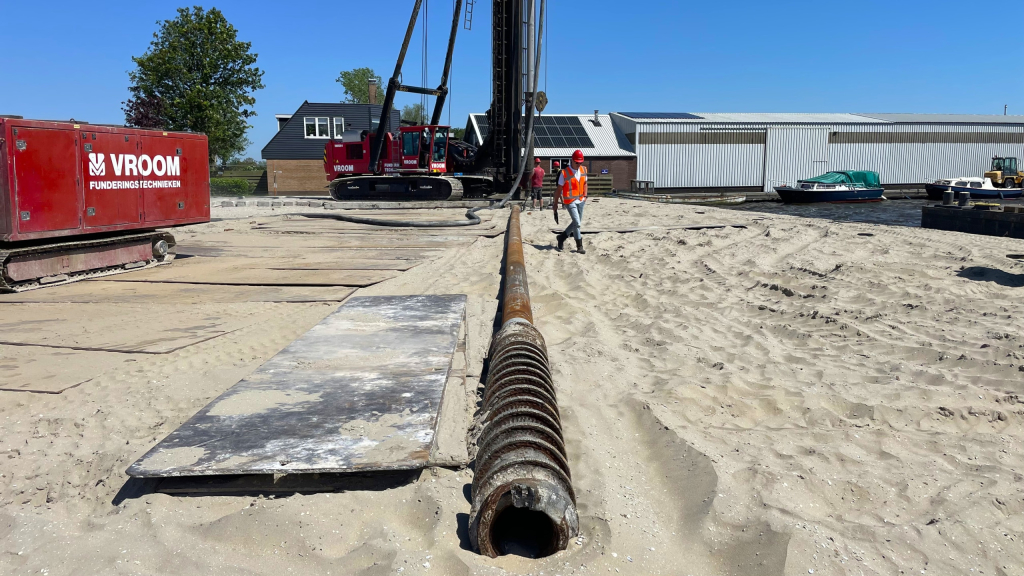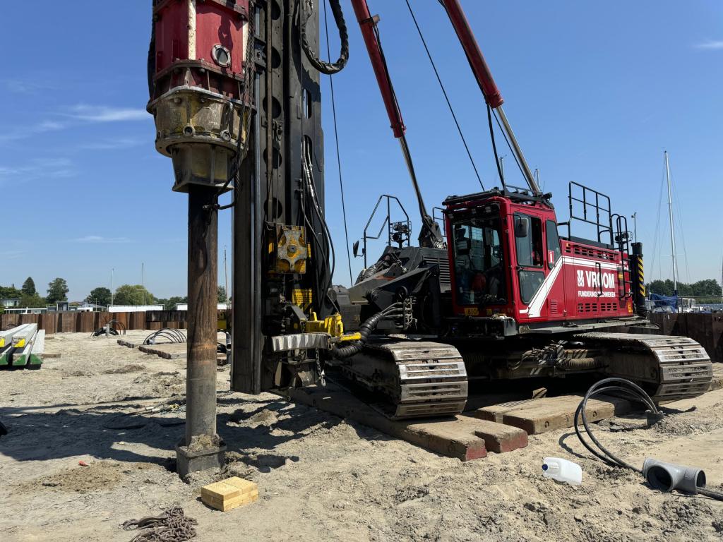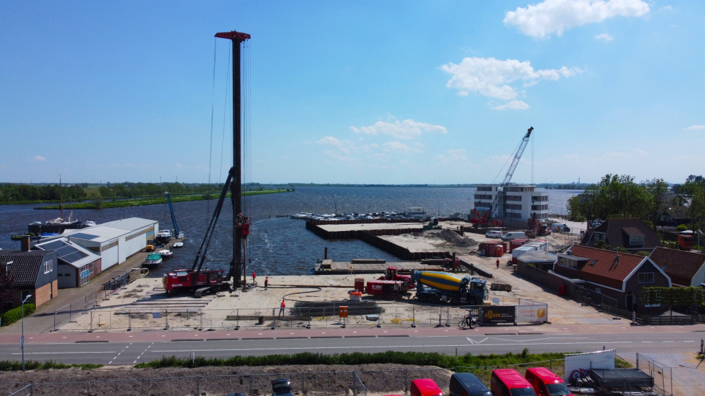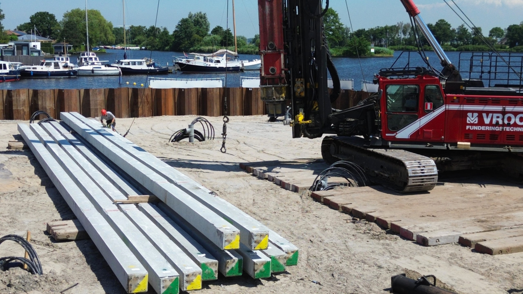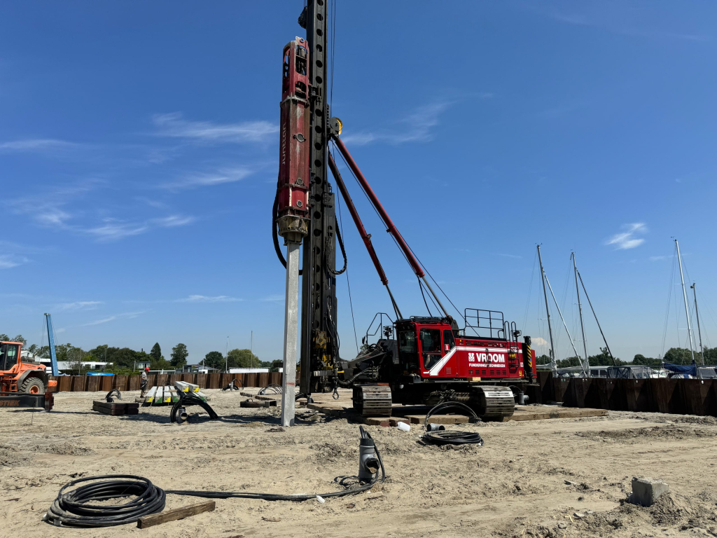 Vroom Funderingstechnieken levert in verschillende fases drie soorten paalsystemen voor dit project: stalenbuis heipalen, DPA schroefpalen en Prefab heipalen (beton). Deze systemen ondersteunen de 90 appartementen en 14 recreatiearken, en zorgen voor een stevige kade voor bootaanlegplaatsen.