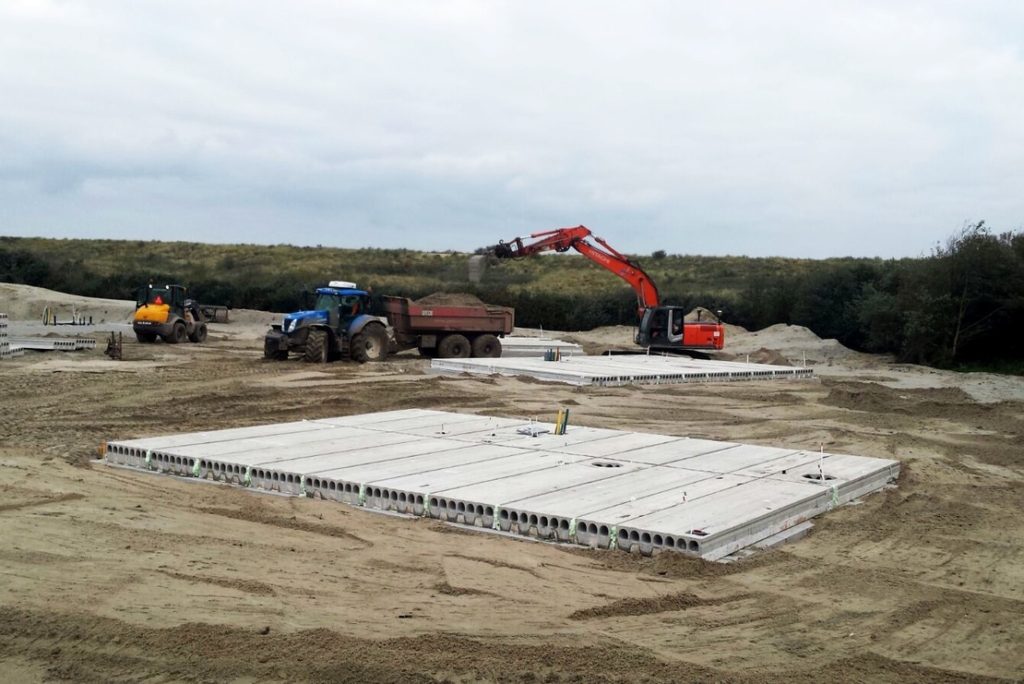 Bovenop de fundering monteren wij ook de kanaalplaatvloeren. Deze vloeren worden door de leverancier op stapels langs de bouwweg gelost en worden door ons op de juiste plaats op de woning gemonteerd. Omdat er veel installaties onder de vloer lopen en door de vloer naar de installaties in de woning moeten werken we samen met de loodgieter. Na het monteren van iedere plaat wordt direct de installatie gemonteerd.