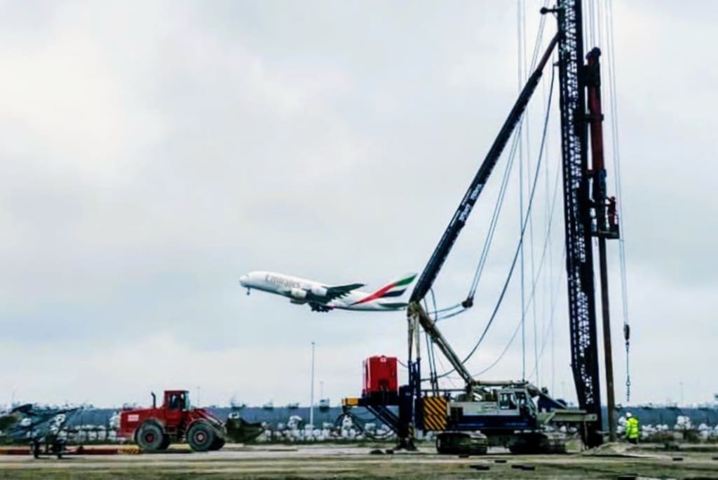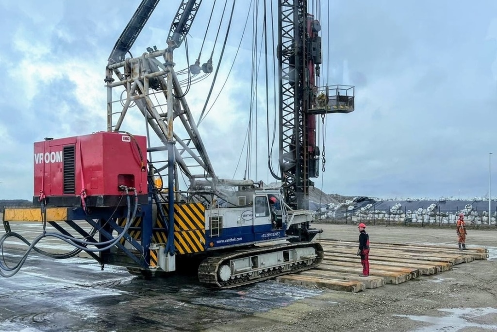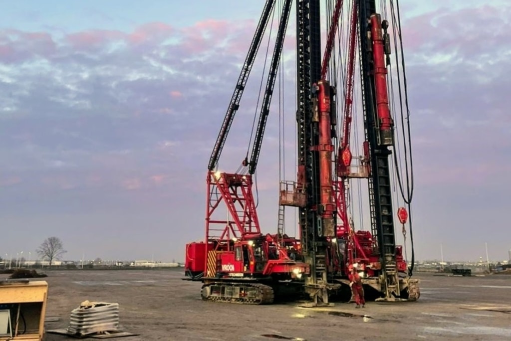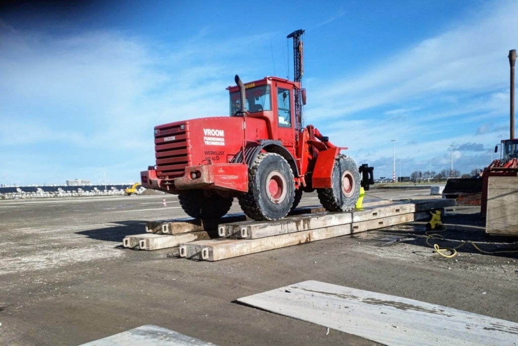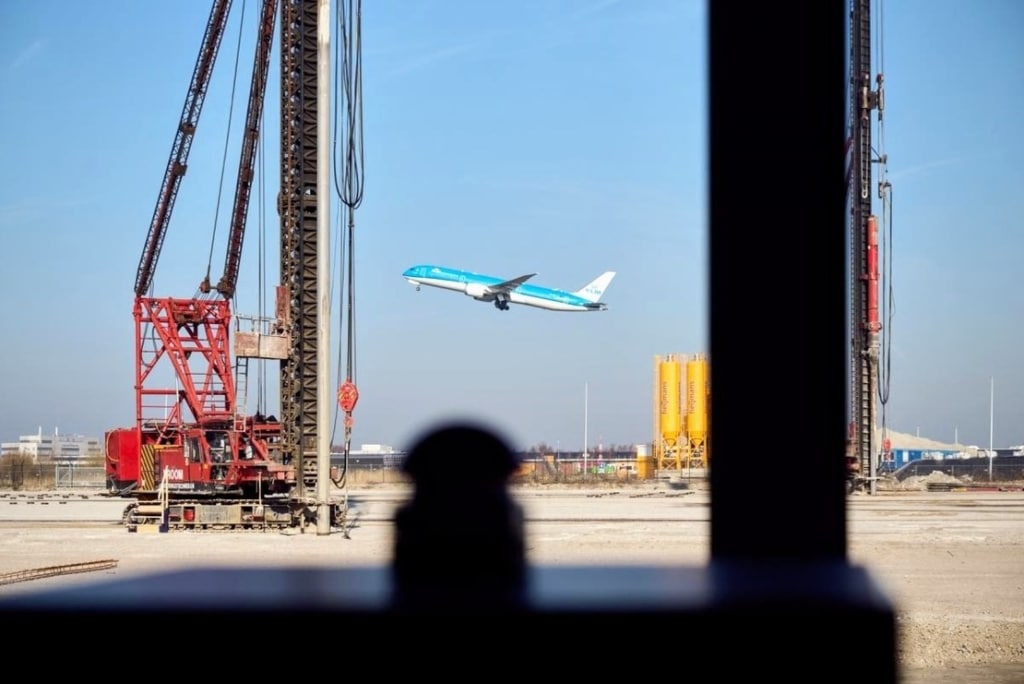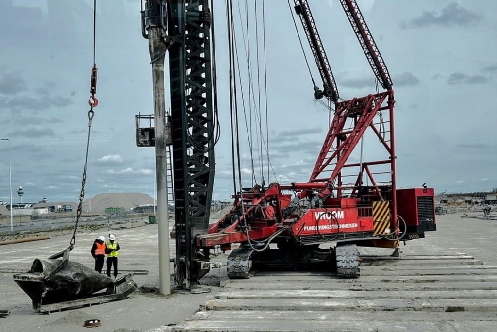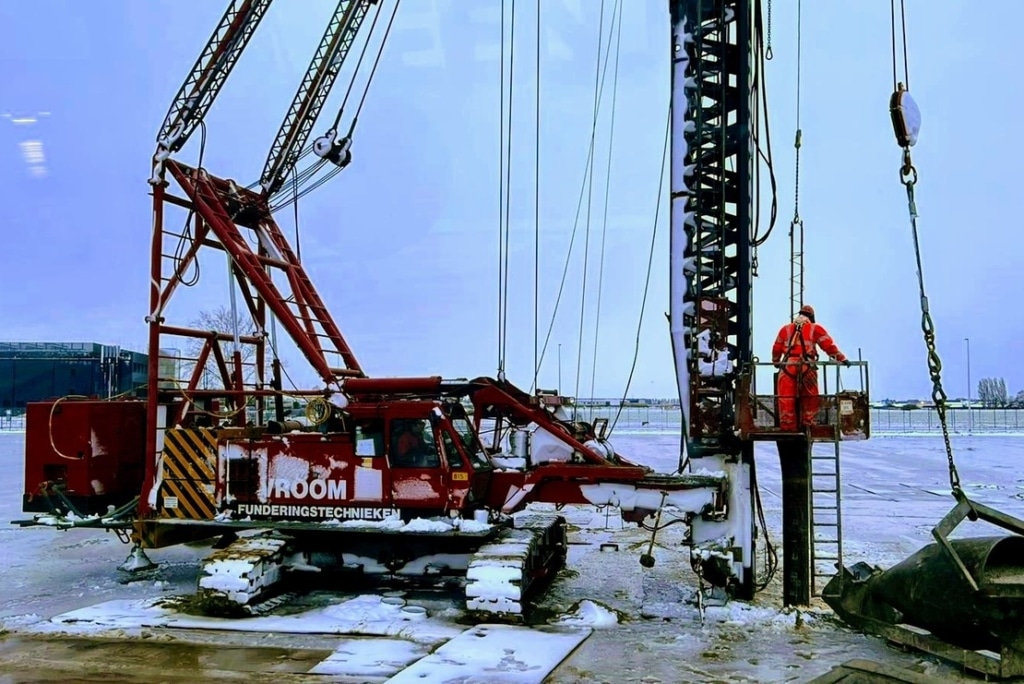 Direct aan de Kaagbaan en onder het scherp toeziende oog van de luchtverkeersleiding op Schiphol maken we circa 1500 vibropalen voor Vrachtgebouw 17.
