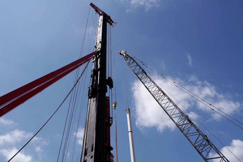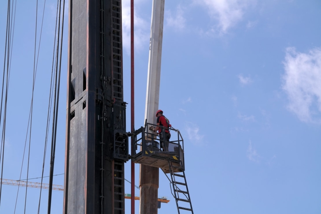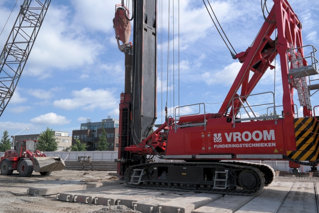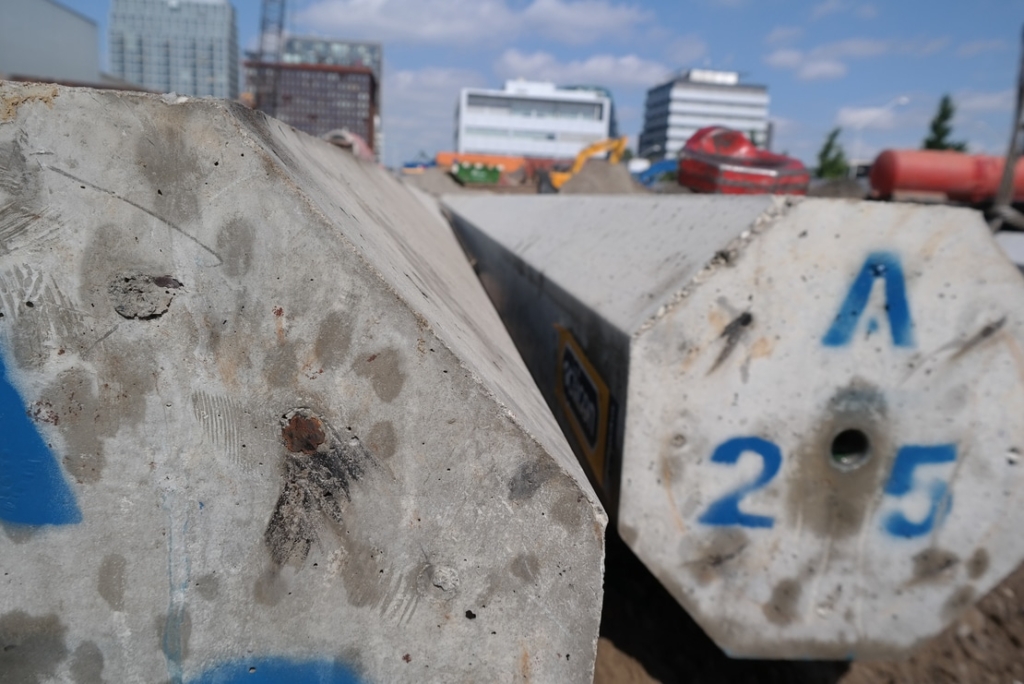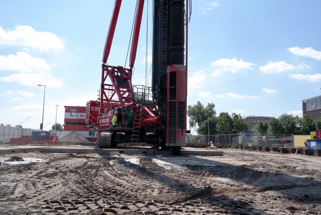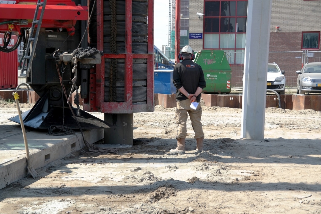 Op het NDSM-terrein hebben wij met twee funderingsmachines, hulpkranen, betonmixers, shovels en een team van collega’s de fundering verzorgd voor ruim 400 wooneenheden. De palen die wij hebben vervaardigd, zijn vibro-combipalen. Bij dit paalsysteem wordt als paalkern een prefab betonelement (octicon) in de buis gehangen en op diepte gebracht. Tijdens het vervaardigen van de palen hebben wij gebruik gemaakt van een geluidsmantel om het geluid te reduceren.